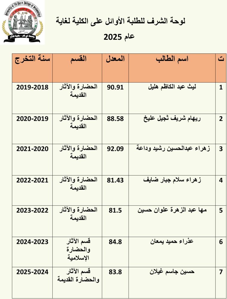 لوحة الشرف للطلبة الأوائل على الكلية لغاية 2025