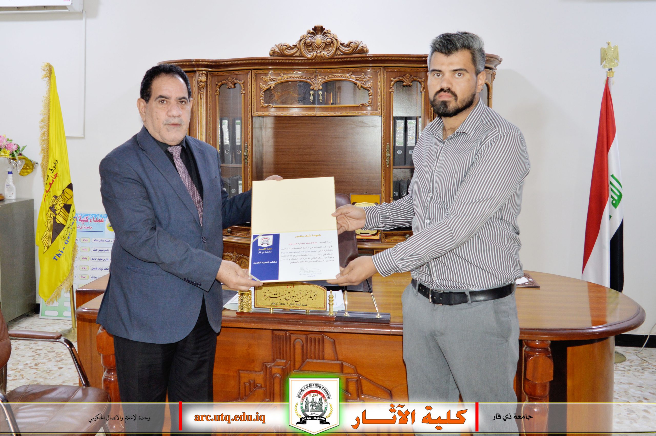 تقديرًا للإبداع والتميز، كرمت عمادة كلية الآثار بجامعة ذي قار، ممثلة بالدكتور عبد الحسن حنون جبرة الله، مدير شعبة النشاطات الطلابية الأستاذ محمود جبار دعبول، والطالبتين حميدة عبد الستار عبد علي وفاطمة صدام عبد الحسين، بحضور رؤساء الأقسام العلمية، لحصولهم على المركز الثاني في معرض الفنون التشكيلية والأعمال اليدوية الذي أقامته الجامعة مؤخرًا.