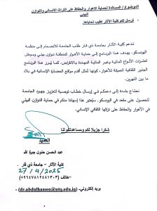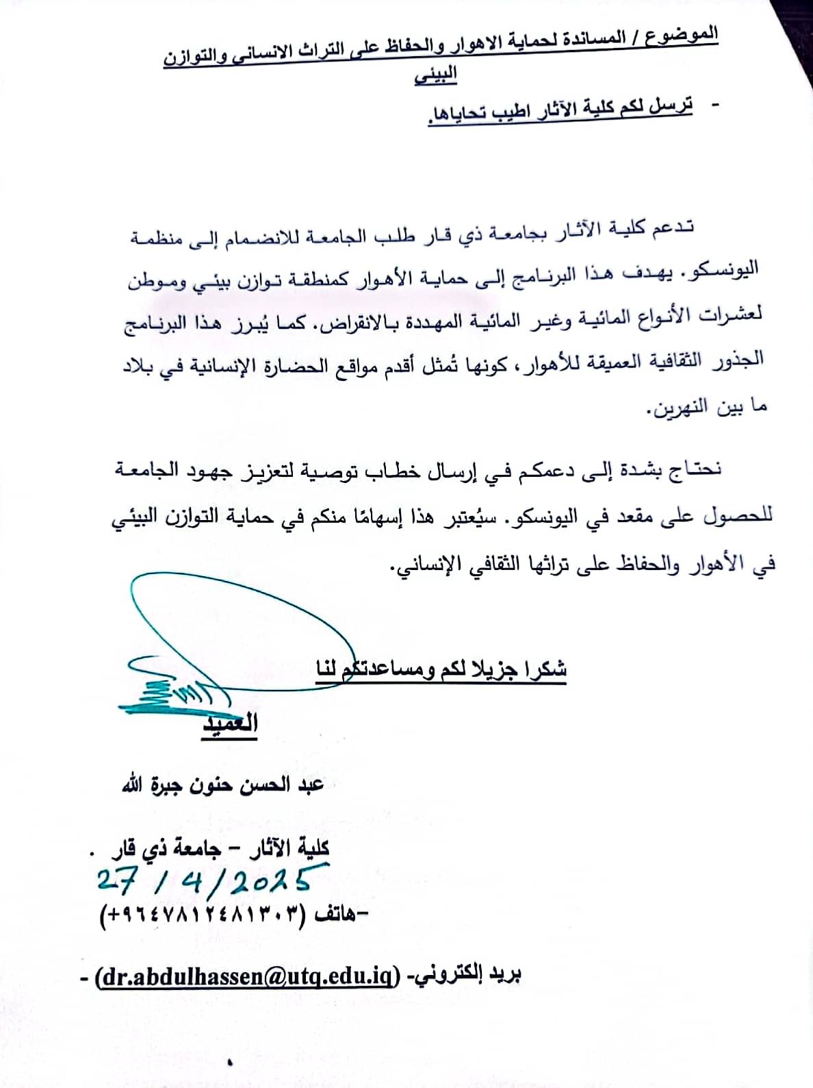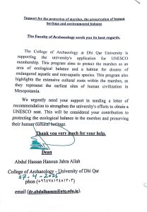 يبارك عميد كلية الآثار / جامعة ذي قار الاستاذ الدكتور عبدالحسن حنون الجبرة الله حصول جامعتنا العتيدة على كرسي اليونسكو الخاص برقمنة تراث الأ هوار ، ونشكر كل من سعى وعمل على تحقيق هذا الانجاز العلمي المتميز وعلى رأس الفريق السيد رئيس الجامعة الاستاذ الدكتور كمال الياسري وبقية الاخوة العاملين ، وتفتخر عمادة كلية الآثار / جامعة ذي قار وكادرها التدريسي انها كانت رائدة وساعية بجد ومثابرة واخلاص الى تحقيق هذا الانجاز العلمي المتميز والكبير ، وبلورة هذه الفكرة وتطبيقها على ارض الواقع من خلال الحصول على دعم عدد من الجامعات الأوربية والمراكز العلمية العالمية ذات الاهتمام بتاريخ وتراث وآثار مناطق الاهوار ، مثل جامعة ريدننغ البريطانية وجامعة روما تري و جامعة سابينزا وجامعة سيينا الايطالية ومركز كامنيس للدراسات القديمة للبحر المتوسط الايطالي ، والحمد لله على منه وتوفيقاته