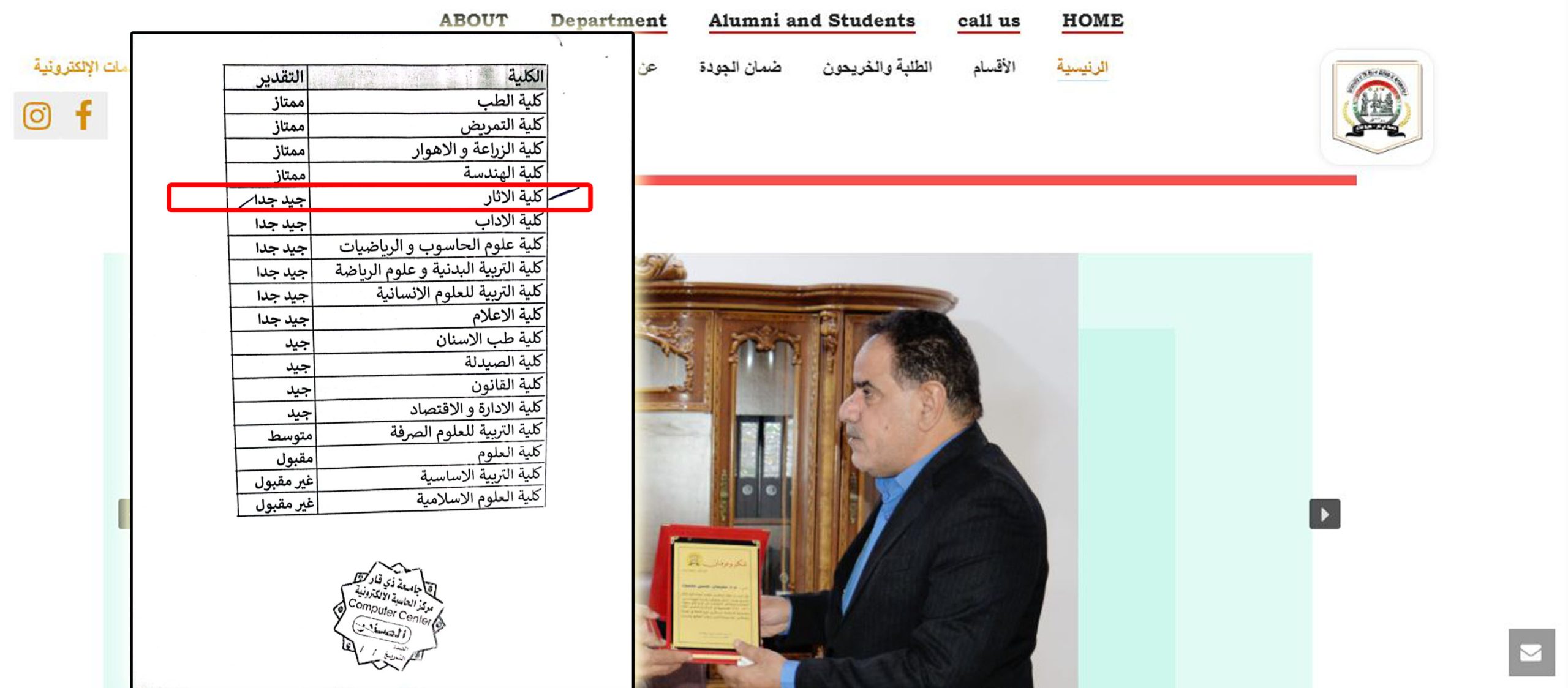 نتيجة لتظافر الجهود المتواصلة للارتقاء بمستوى التمثيل الرقمي للكلية بما يتناسب مع مكانتها العلمية ،حصل الموقع الإلكتروني الرسمي لكلية الآثار /جامعة ذي قار على مراتب متقدمة وبتقدير (جيد جداً) في التقييم السنوي للمواقع الالكترونية الذي أجراه مركز الحاسبة الإلكترونية في الجامعة .
