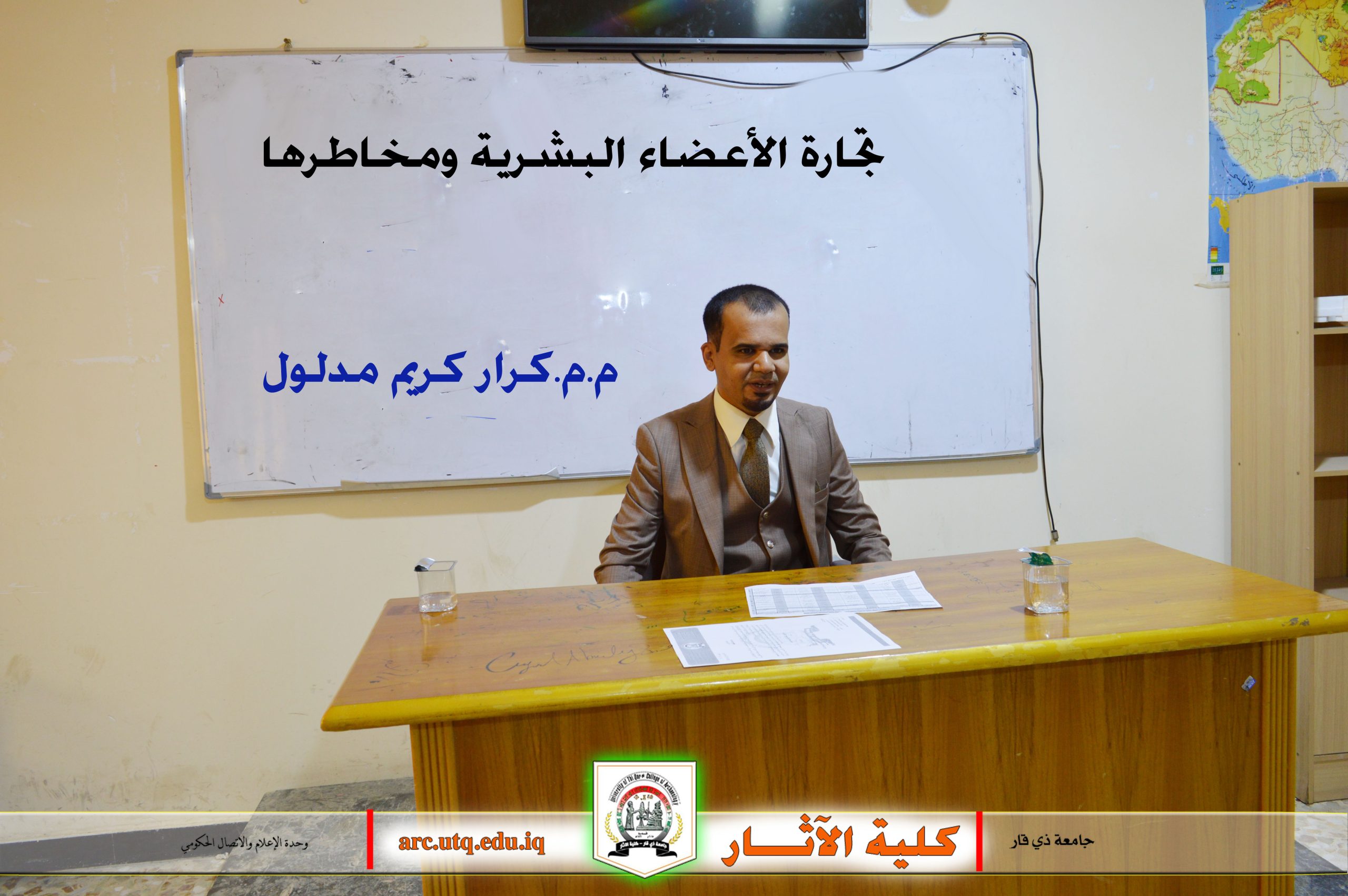 برعاية رئيس جامعة ذي قار الأستاذ الدكتور كمال حامد الياسري ،وبإشراف عميد كلية الآثار الأستاذ الدكتور عبد الحسن حنون الجبرة الله ،أقامت وحدة الارشاد النفسي الجامعي ندوة حضورية بعنوان (تجارة الاعضاء البشرية ومخاطرها ) ضمن فعاليات أسبوع الارشاد النفسي ،حاضر فيها م.م.كرار كريم مدلول التدريسي على ملاك الكلية ،بحضور رؤساء الأقسام العلمية و جمع من أساتذة وموظفي وطلبة الكلية .