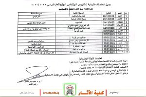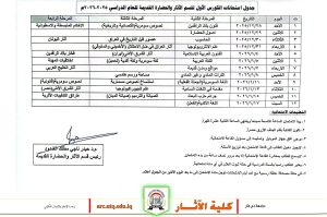أعلنت الأقسام العلمية في كلية الآثار /جامعة ذي قار عن جداول الامتحانات الفصلية(الكورس الأول) للعام الدراسي 2025-2026 ،والتي تنطلق يوم الاحد المصادف 2025/12/28 .
